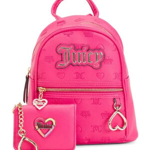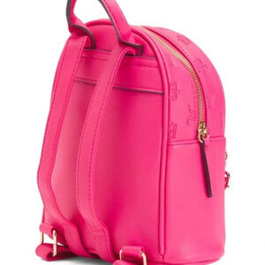 Embossed design, brand logo detail, gold tone hardware, adjustable backpack straps, top carry handle, key charm included, card case included