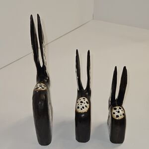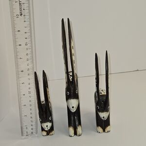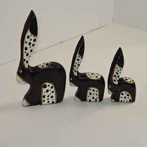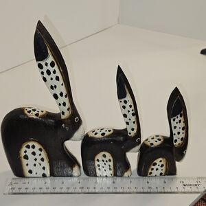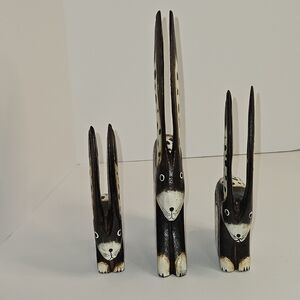 This charming handmade and hand-painted 3-piece rabbit set is a delightful blend of artistry and whimsy. Each rabbit features a unique, elongated ear design adorned with bold black-and-white patterns, adding a playful and modern touch to their rustic character. Crafted from wood, the natural texture and earthy tones are beautifully enhanced by the intricate hand-painted detailing, including the spotted designs that give each piece its distinctive personality.