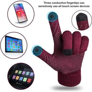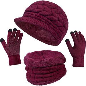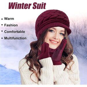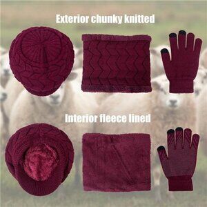 3 PCS Knit Winter Hat Gloves Scarf Set Beanie Neck Warmerβ Touch Screen Maroon