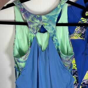 2. Ivivva Tank Top,. Mint green with blue watercolor / floral pattern accents. Ivivva logo on the upper back. Built-in sports bra.