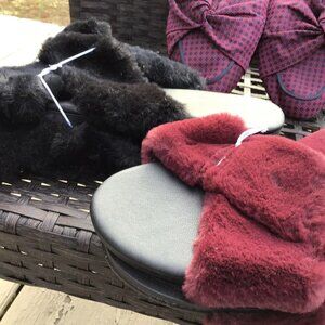 1 Burgandy Furry Slipper, 1 Black Furry Slipper, 1 pair of A New Day Women's Natalee Bow Backless Mules in a red and navy blue plaid pattern.