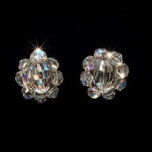 3. Clear aurora borealis bead cluster earrings – Dome-shaped cluster earrings made of faceted clear beads with aurora borealis flash, giving a sparkling iridescent look all around. clip on