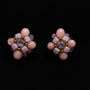 2. Pink & lavender beaded flower earrings – Cluster earrings with pink teardrop beads, square lavender beads, faceted light-purple beads and small gold-tone accents arranged in a floral design. clip on
