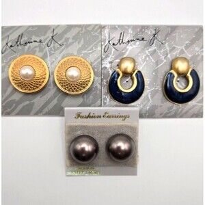 This product is a set of three pairs of vintage earrings, two pairs by Katherine K and one pair unbranded. The earrings feature simulated round pearls in white and gray color with blue enamel material on the door knocker style pair. They are designed for the lobe area and have a variety of styles, making them a unique and stylish addition to any woman's jewelry collection. Perfect for those who appreciate vintage and antique jewelry, these earrings offer a touch of nostalgia and charm to any outfit.