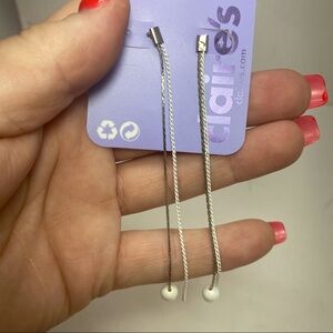 - (1) pair of long, silver-tone chain earrings with faux pearl detail. Approx. 4” long.
