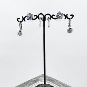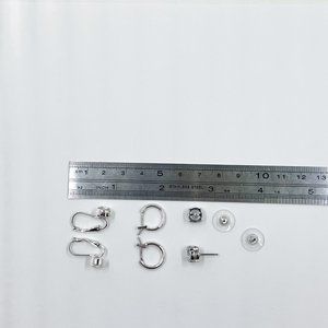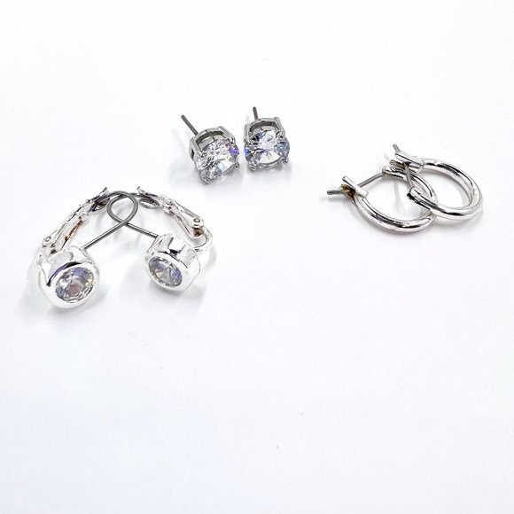 3 Pairs Shiny Silver Tone Post, Hinged Hoop, and Leaver Back Earrings. Post earrings are 3/8” in diameter, hoop earrings are .5” in diameter, and the leaver back earrings are .75” long by .25” in diameter. Earrings are previously loved and are in great condition.
