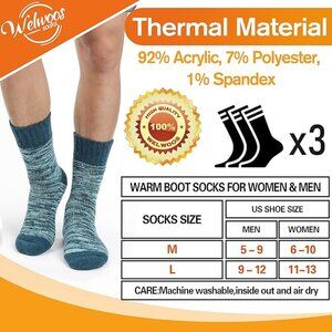 -【Thermal Material】Welwoos winter heated socks are made of 92% Acrylic, 7% Polyester, 1% Spandex, which have thick layers, warm brush, comfortable touching and no itching issues. There are 3 pairs warm winter socks in one pack for men & women.