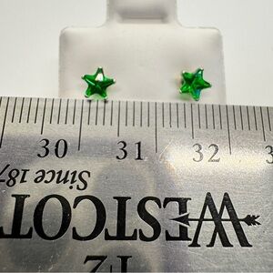 Three sets of sterling silver stud earrings. Includes green star and black and gold round studs. Perfect for any occasion.