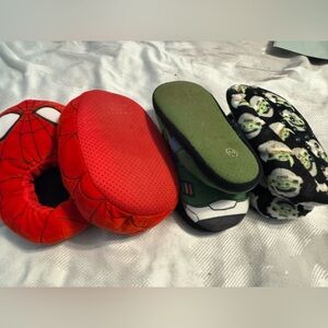 Set of three kids character slippers. Features vibrant designs in red, green, and black. Perfect for cozy indoor wear. Every kid will flip over these!!!