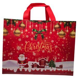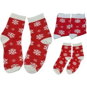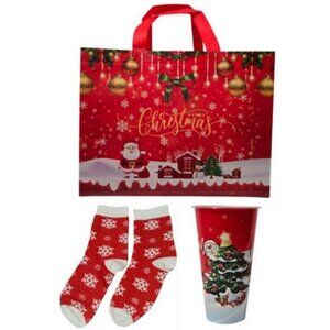 * Items Included: The set comprises a red non-woven gift bag with a Santa Claus and Christmas ornament design, a pair of red ankle socks featuring white snowflakes, and a red cup with "Merry Christmas" text and a snowman graphic.
