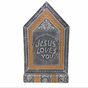 The key holder has three hooks with “Jesus Loves You” engraved in it.