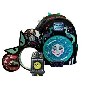 Charming 3 piece set Haunted Mansion backpack, wallet, and ears. Set includes Disney Parks Loungefly Haunted Mansion Madame Leota mini backpack, Shanghai Disney Haunted Mansion ears headband, and Loungefly Haunted Mansion Clock Cardholder Wallet (hard tag). All new with tags. first photo is AI.