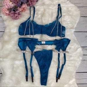 3 Pcs Blue Crystal Bra Panties Garter Lingerie Set