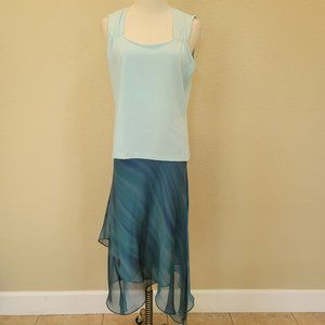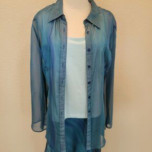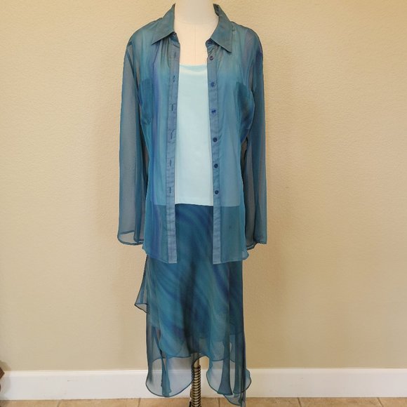 BELIZA light weight 3 pieces set has a tiered flow lined skirt with a swirl of blue colors, solid light blue colored tank top and a button front blouse with two breast pockets. The soft blues of the set is so beautiful as it changes color effect with a translucent look. I originally purchased these pieces as separates. So the skirt is size 10, the tank is size L and the outer blouse is a size 16 so I could have a flowing effect as I moved.