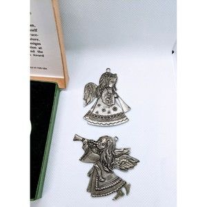 2 vintage (70s) pewter musical angels with green ribbon - great condition but could use a cleaning