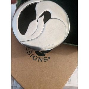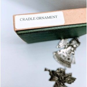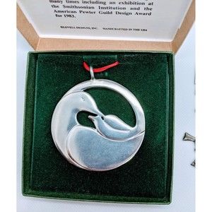 1 New In Box - Never taken out of box - Lovell Designs Pewter CRADLE Ornament Mother Child Bird Ken Kantro Signed on back, still taped down red ribbon, highly polished