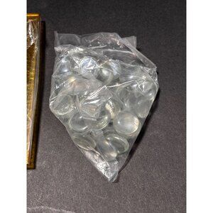 Stylish set includes 3 gold-speckled glass tealight holders, a golden tray, and decorative stones. Suitable for home decor or events. Tealights not included.