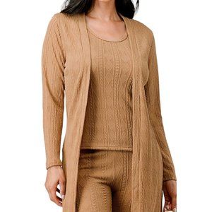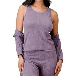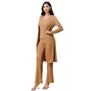 Three-Piece Charm: This exquisite set features a trio of perfectly matched pieces – a knit tank top, wide-leg knit bottoms, and a long knit cardigan – that come together to create a harmonious look.