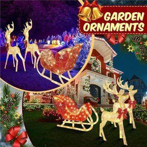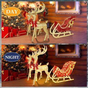 🧿Large Set: this delightful decorating set includes 2 deer and 1 sleigh, covered in shimmering mesh fabric, each illuminated by warm white LED bulbs; Each deer wears a red bow and bells around its neck; The reindeer image creates a festive atmosphere at Christmas while bringing joy to your family and friends