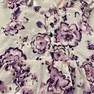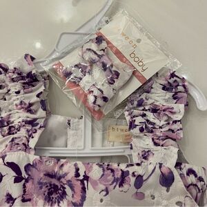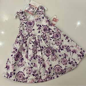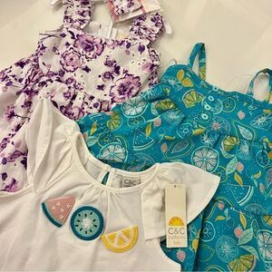 Purple dress with hair accessories, turquoise print dress, and white smocked fruit embroidered tunic top. All are brand new, never worn, no flaws. My kid just grew too quick. The top and purple dress have retail tags attached, the blue one just has the plastic tag without the actual retail tag attached. All are size 24 months. Price is for all 3 as a set.