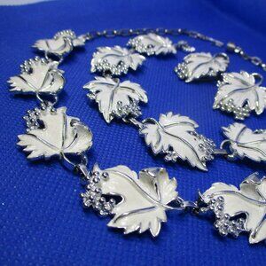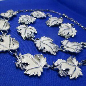 This is a vintage never-worn Sarah Coventry Whispering Leaf Necklace, 1967 fruit salad enamel grapes with leaves white enamel and silver-tone metal clip-on earrings with the matching necklace and bracelet. Any dark areas on the silver-tone metal are in my pictures only. The white enamel is perfect for the earrings and necklace, the bracelet has 2 little pinhead enamel loss spots which you can not really notice when wearing it.