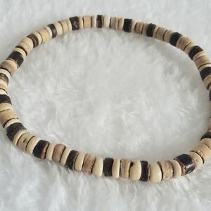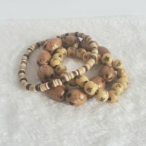 3 Piece Wooden Beaded Bracelet Set. Versatile, can be worn with 1 or all 3 together. Each are a stretchy elastic band for easy on and off, approximately 2.5" in diameter. All earth tone colors of tans and browns. Bands of old artisan barrels, coconut island heishi shells & wooden Chinese symbol karma beads. Excellent condition!