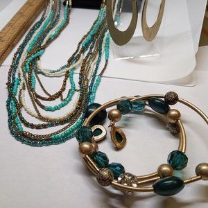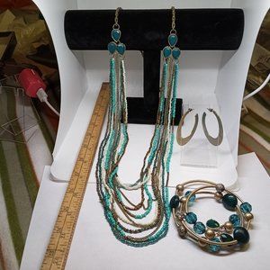 Selling a three piece costume/beaded necklace, earring and bracelet set. The Necklace has a few stones that are jutting out but still very attached to the setting.