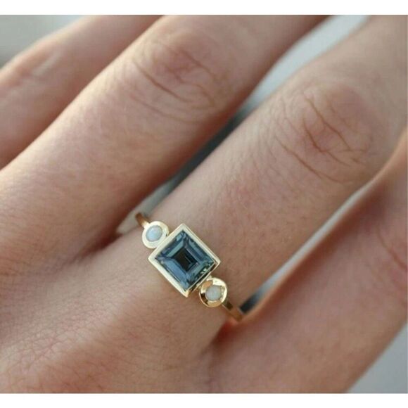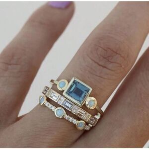 Beautiful and versatile 3 piece ring set in a modern design that would accent any outfit. Yellow gold setting with blue square stone in center accented by opalescent side stones in first ring. 2nd ring with rectangular crystals and round crystal accents. 3rd ring has rounded opalescent stones. 3 rings for the price of one. Beautiful pieces. All Size 9