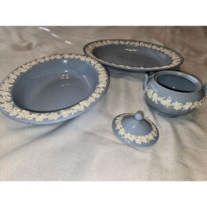 3 Pieces Wedgewood Queensware White on Blue 2 Serving and 1 Lidded Sugar Bowl