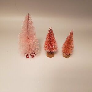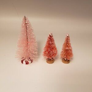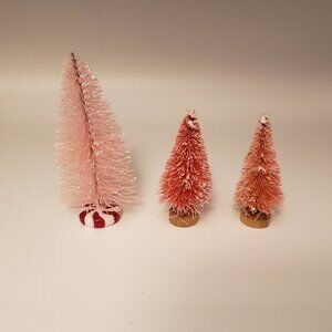 3 Pink Bottlebrush Christmas Trees Flocked Snow Wire Plastic Wood Base Decor