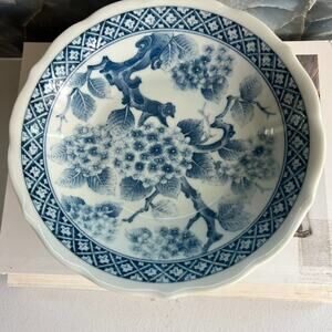 These porcelain bowls feature a beautiful blue and white cherry blossom design with a fluted rim, measuring 8 inches in diameter. Made in Japan, these bowls showcase traditional Japanese culture and craftsmanship. Perfect for collectors or those looking to add a touch of Asian elegance to their home decor, these bowls are a lovely and unique addition to any table setting.