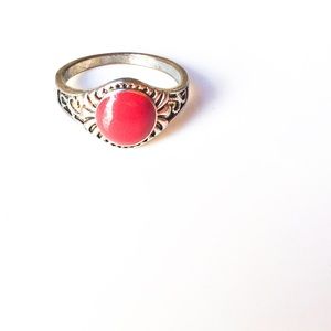 -gold band with red stone and detail surrounding