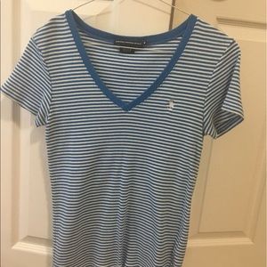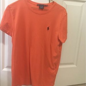 All size medium. The orange and the striped are Ralph Lauren Sport. The lighter blue has a more thicker cotton feel to it. Two of them are crew neck and one is V neck.
