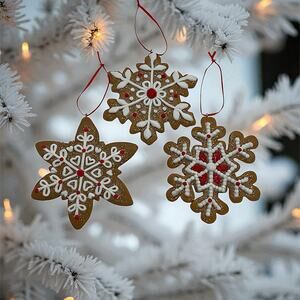 3 Red White Icing Gingerbread Snowflake Cookie Christmas Ornaments Baker