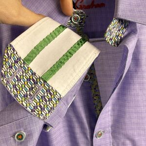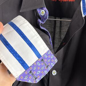 Bundle of three Robert Graham men’s shirts, all size Medium. Includes striped, micro-check, and solid styles with RG’s signature contrast cuffs. All are pre-owned with light signs of use, including some deodorant marks in the underarm areas. Fabric and seams are still in good wearable condition.