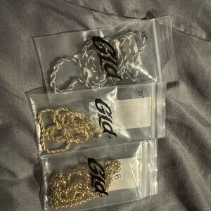 I bought them but I prefer the thinner necklace. GLD Brand comes with box, case and lifetime warranty card. All 3 must be sold together because of only being 1 warranty card