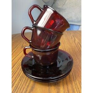 (3) Royal Ruby Red Glass Arcoroc France Coffee Punch Tea Cup & Saucer Sets