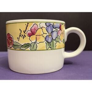 This set of three stoneware cups by Sakura features a beautiful floral design by Sue Zipkin in a Creme Brûlée pattern. The cups are round in shape and come with handles, making them suitable for hot beverages. They are also microwave and dishwasher safe, making them convenient for everyday use. The cups were manufactured in 1995 and are considered vintage.