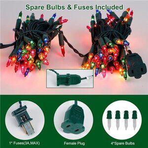 🧿3 Pack Green Wire Christmas Lights: Our 3 x 150 count multicolor incandescent mini lights will light up you home in the coming up Christmas. Each bulb space 2.5in, 2.5V and 0.42W per bulbs, built-in 3A fuse for safe use. Extra bulbs and fuses are included. High quality UL certified products ensure the safety of you and your family
