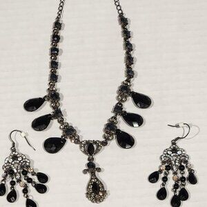 Vintage Jet Black & Crystal Rhinestone Teardrop Necklace Dangle Earrings 18"