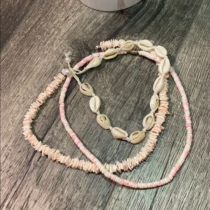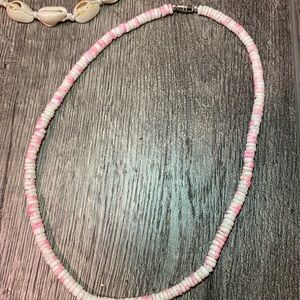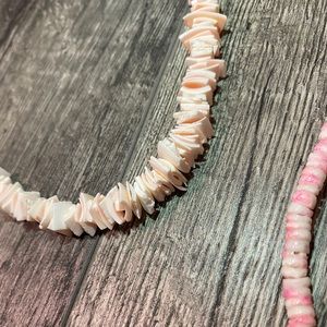 If you purchase this listing, you get these 3 beautiful summer necklaces. One is a light pink chipped pooka shell necklace which I bought in Florida. The other is a smaller light pink shell necklace that is super smooth. The last is a white Hawaiian Shell necklace, which is chocker style.