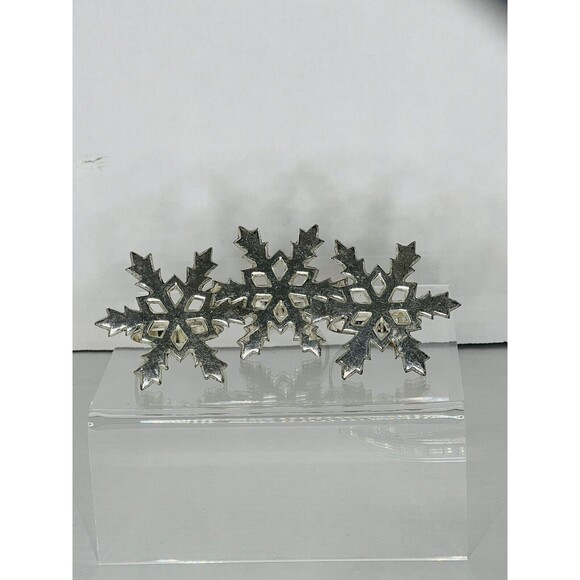 3 Silver Plated Snowflake Napkin Rings. They do show wear. Would be perfect for a rustic winter theme.