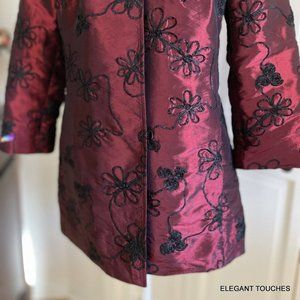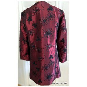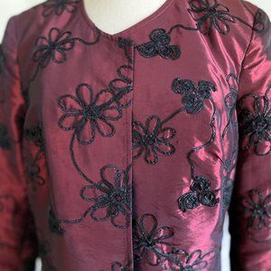 3 Sisters Jacket Womens Open Front Medium Red Black Embroidered Taffeta Coat