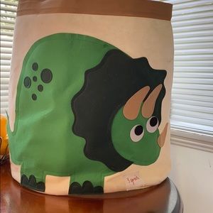 Collapsible canvas bin with felted stegosaurus. Great for toys, laundry, towels... anything really. Bright colors and fun! Coated canvas interior. Lightly used to store stuffed animals. No fading. Some surface dust but no holes, marks or stains.