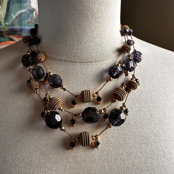 3 Strand Navy/ Smokey Violet Glass Bead and Gold Bead Necklace with gold colored metal findings originally purchased at Nordstroms in costume jewelry department to wear with the Iridescent taffeta early 1980s cocktail dress with the crumb catcher bodice .The color of the glass beads matches the dress perfectly .....