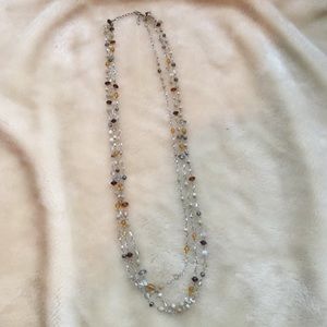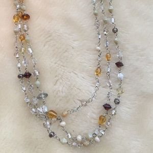 3 Strand Necklace with Multi colored beads in brown, mustard gold, gray and cream. Silver hardware with clasp. Bought from a boutique shop. No missing beads.