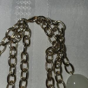Pre-owned 3 strand necklace on a gold- tone chain. The chunky glass stones are heavyweight and very impressive. Powder Blue stones are frosted and the white stones are a solid white with flat backs. Lobster claw clasp. The shortest length that goes around neck measures 17" from clasp to chain. It lays on body 12" at longest length.