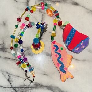 Plastic beads and wooden objects the fish is signed. They are three individual strands. Feeds themselves measure about 13 inches long. The fish is the longest one at 19 inches long.