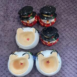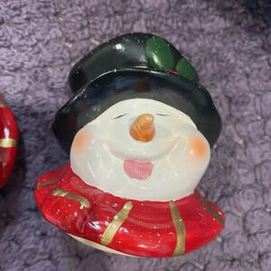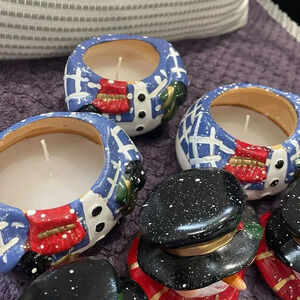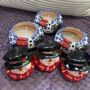 (3) Studio Pottery Handmade Hand painted Snowman With Candle Filled With Lid