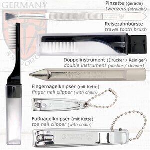 🧿CONTENTS: Nail scissors, finger nail clipper, toe nail clipper, sapphire nail file, tweezers, nose hair scissors, travel tooth brush, hair comb, shoe horn, double instrument (cleaner/pusher).
